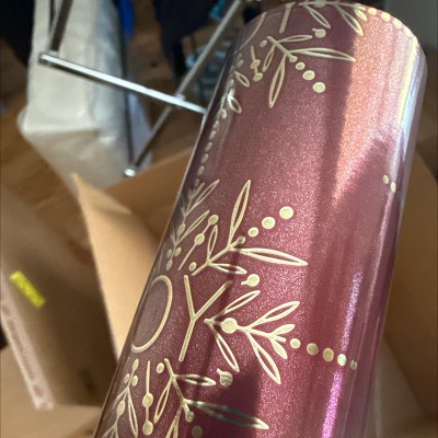 A: The gift wrap features allover golden snowflake graphics on a dark red background.
