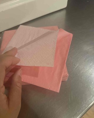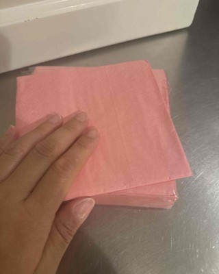 These are small beverage, napkins in a light pastel pink color that would match well with many party themes. The paper is soft and absorbent, and does not tear easily. There is also no lens that comes off of the paper. The paper is colored on one side and white on the other, it is a single ply beverage napkin. The size of the napkin is pretty small compared to the typical white paper napkin. I received an incentive to write this review.