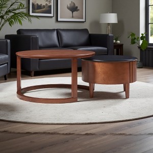 Versatile Style: A 2-piece vintage round nesting coffee table featuring a fluted drawer, black and walnut two-tone finish, versatile layered design, and sturdy construction for both style and functionality.