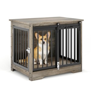 32" Dog Crate Furniture, Chew-Resistant Indoor Dog Kennel with Sliding Barn Door, Wooden Decorative Dog Cage End Table for Small/Medium Dogs
