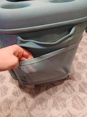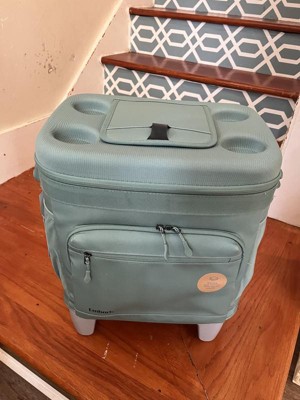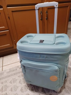 Love this cooler!!! The color is perfect! The plastic inside comes out for easy cleaning which is awesome! There are two mesh pockets on the side and two pouches in the front with one of them being insulated. The top has four can holders and a flap to open to grab a drink. The Velcro is super strong on the top flap as well. We haven’t tried it at the beach yet but the wheels look like they will work great on the sand.