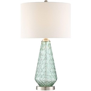 - Coastal contemporary table lamp from the 360 Lighting brand. Textured sea foam green glass body. Brushed nickel finish accents. Off-white drum shade. 8-foot long cord.