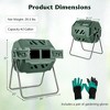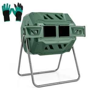 Details Specifications Color Black/Green Material PP, Metal Overall Dimensions 70 x 63 x 93 cm Size of the Sliding Door 26 x 16 cm Capacity 160 L/42 Gallon Net Weight 9 kg Box Qty 1(May vary by batch) Overview ? Comes with dual chambers for fast and efficient composting ? 2 large sliding doors make it easy to load a lot of waste at once ? The 360¡ã rotating design makes it convenient to pull out fertilizer ? Fast and efficient composting in 4-6 weeks, enjoy rich fertilizers all year round ? The ventilated holes promote air circulation and help absorb oxygen ? Made of durable PP material, built to withstand the rigors of outdoor use ? The powder-coated metal supporting frame is not easy to rust, peel, or chip ? The triangular structure provides strong support, and not easy to wobble ? Includes a pair of gardening gloves for digging, planting and other gardening work ? Includes a screwdriver, features a simple structure, easy to install the compost bin ? Suitable composting material: leftovers, kitchen waste, and garden clippings can be fermented