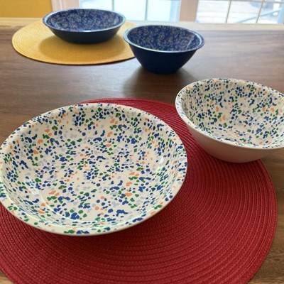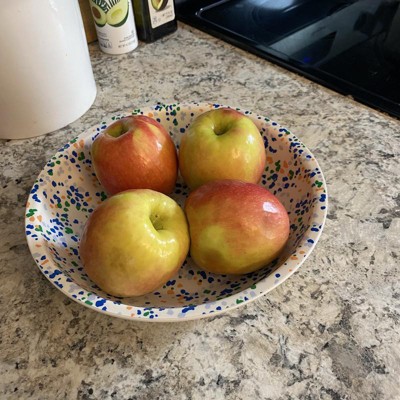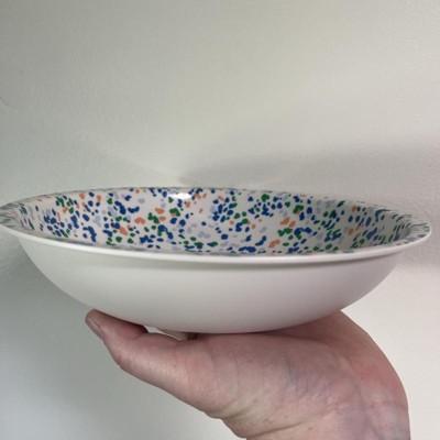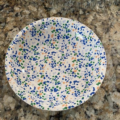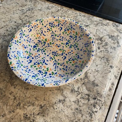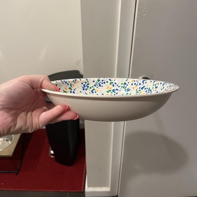 [This review was collected as part of a promotion.] Love this bowl for vegetables and salads but I am not so sure if it would be ideal for soup since it is not very deep. It is wide though! For soup maybe if the bowl stays on the table and you serve guests at their seat somehow then it won’t spill. Otherwise would stick with salads, vegetables, fruits, stuff like that. Love the splatter color pattern and unbeatable material I received an incentive to write this review.