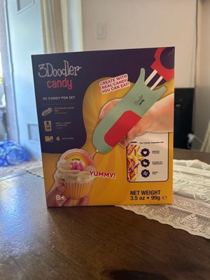 [This review was collected as part of a promotion.] 3doodler candy 3D pen It’s an interesting product for kids and adults too.Out the box the product looked great. It took a little getting used to,after some practice and experiments you Can do any kind of design or writing.i wish it can load more capsules rather than 2 because they finished very quickly and you need to reload candy capsules to continue your design. The candy is little bit hard to chew and it gets stuck on your teeth.overall it’s a fun activity.