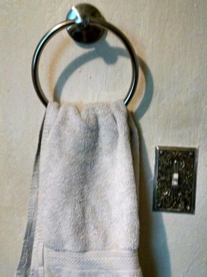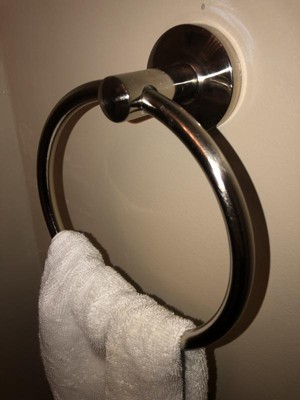 Shiny, sleek, classic silver, hand towel holder. Rounded design. Holds plush towels or decorative flour sack kitchen towels. Also comes with large towel bar to hold a bath set and a medium sized bar that could hold a single bath towel or set of hand towels. I used the hand towel ring in my kitchen to hold a hand towel because it matched my stainless steel appliances. Easy to install but it does require a drill.