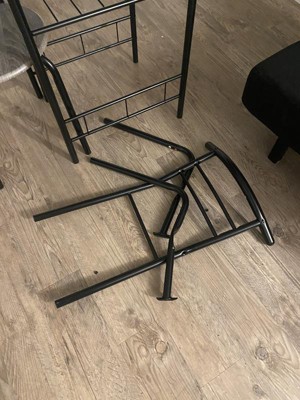 You’ll need to bend the aluminum chair legs by hand in order for all of the screws to line up for correct attachment. You’ll need strong-ish arms and hands to do this on your own. Also warm (not hot) plates leave indentations in the table top. Placemats are a must. Otherwise it’s good enough for small spaces and the price point.