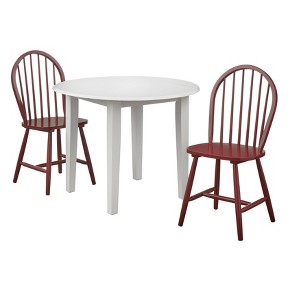 Versatility allows you to expand seating in your dining space with the 3 Piece Chadwick Drop Leaf Dining Set from Buylateral. Perfectly sized for a breakfast nook or smaller area, the two drop leaves easily extends for guest or lowers when you need to maximize space. Each individual leaf is 7 inches, expanding the table width to a 40-inch diameter in a white finish. Coordinating spindle back Windsor chairs in a red finish create a timeless classic look. Constructed of solid rubberwood, this set easily complements many styles of room décor from contemporary to modern farmhouse.