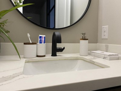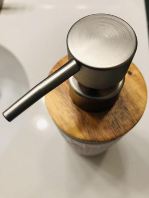 I really like how this set goes so well with our modern farmhouse bathroom look. It has the wood accents around the accessories so it gives the bathroom a cozy and relaxed environment. The textures around feels and looks like it’s a very expensive set. Sometimes the soap pump on some dispensers is hard to pump but this one easy to use. I looks great in our bathroom!