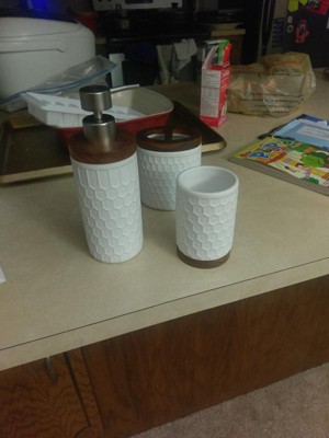This bathroom set is so cute! The set includes a soap dispenser, storage cup and toothbrush holder. Each piece has a matte white honeycomb design with a wood accent. The soap dispenser has matte silver pump. The toothbrush holder holds about 4 toothbrushes without being too crowded. The storage cup is perfect for cotton balls or cottons swabs.