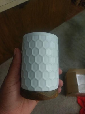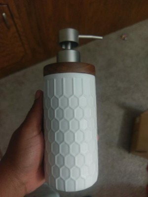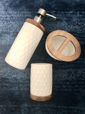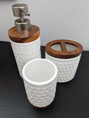 This set is gorgeous!! I love the honeycomb texture and the wood accents. Definitely a great look for a variety of design styles. Pump on the soap dispenser works great and I use the toothbrush holder for makeup brushes instead! I would highly recommend!