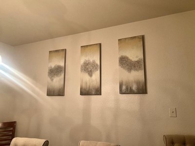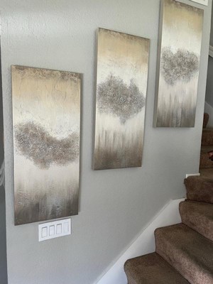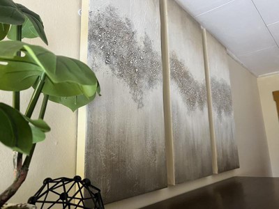 [This review was collected as part of a promotion.] This is a really nice set of artwork. I love how they aren’t just printed canvas and that they have actual dimension and texture to them. It makes them stand out so much more that way feel higher end. You can see and feel actual rocks that were set and painted as part of the pieces. I initially got them for our living room but upon receiving them, I realized that there was a lot of glitter over the textured rocks in the center of the canvases. The glitter doesn’t show on the picture and my camera couldn’t capture them either - but they’re there and very sparkly. I ended up feeling like they looked a little too feminine to install in the living room (I’m the only woman in my household) and found a great spot for them in my bedroom instead. They add a touch of serenity and magic while blending nicely in my industrial decor. The manufacturer shipped them carefully with individual bubble wrap and reinforced corners. I highly recommend these if you’re looking for a fun touch of gray, beige and organic textures to add to your decor. They make an instant focal point in the room.