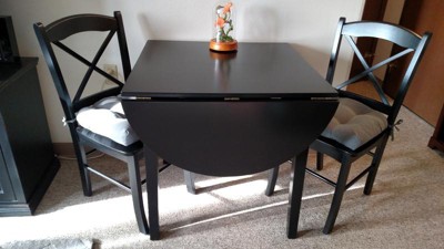 I bought this set a couple of months ago as an addition to my small apartment. It fits the tiny space I had available for a table and chairs, and the fold down leaf is great when I need more space, but stays conveniently out of the way when I don't. I consider myself to be a pro in assembling furniture as I've put together a variety of items over the years. The assembly was easy until I came to the chair seats. I was expecting pre-drilled holes, but there weren't any. As one of the reviewers noted, this makes for sturdier chair. However, I had to use some creativity and maneuvering to get the seats attached by myself. A friend got me some grey pillows which makes the dining set look quite elegant. I am very pleased with they way it fits in with my other furniture.