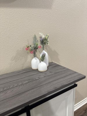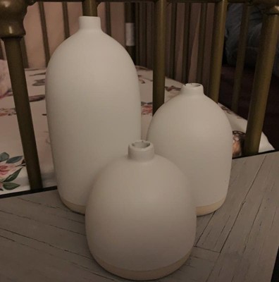I absolutely love this set of 3 decorative vases. They are on the smaller side, and work perfect on our mantle. They would also be great on a side table or in a countertop corner. I added some little fake flowers and I get so many compliments on them. Keep in mind that the mouth of the vase is narrow, so your flowers will need to be petite. They look great without them also.
