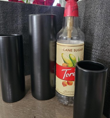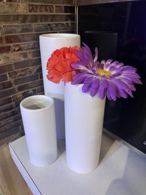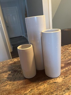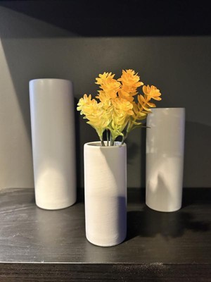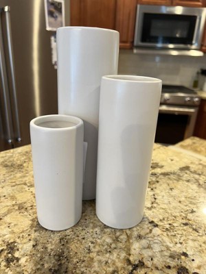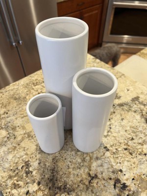 Very modern set of three vases. Love the simplicity and smooth texture. The color is a little bit of a gray white, but not noticeable on a shelf. Would look good with or without filler in it. Was planning on displaying them without flowers or greens.
