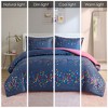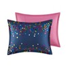 [This review was collected as part of a promotion.] A wonderful accessory to establish a stylishly joyful environment. The brightly colored iridescent, ombre and solid dots are a festive mixture. The background is not a classic navy more so a blue gray blend. The soft comforter offers an adequate source of cozy warmth. The length and width of this bedding draped easily over my twin nine-inch memory foam mattress and four-inch box spring. No fading or pilling occurred after laundering in cold water and drying on medium heat. A twin bed will sparkle with this wonderful item.