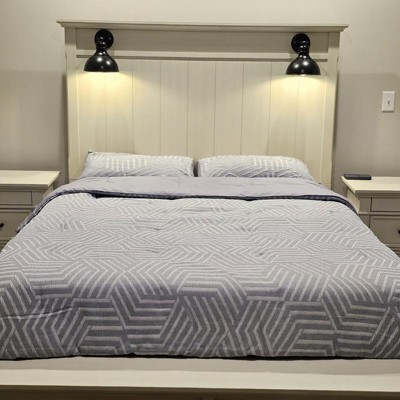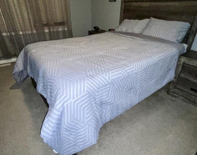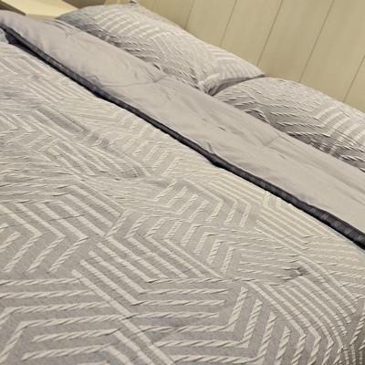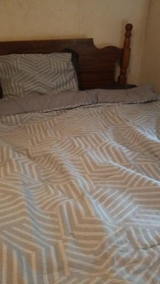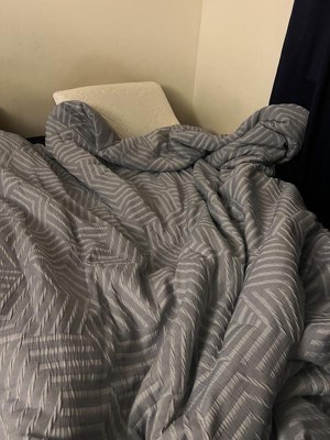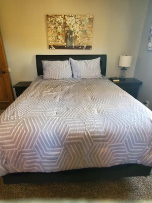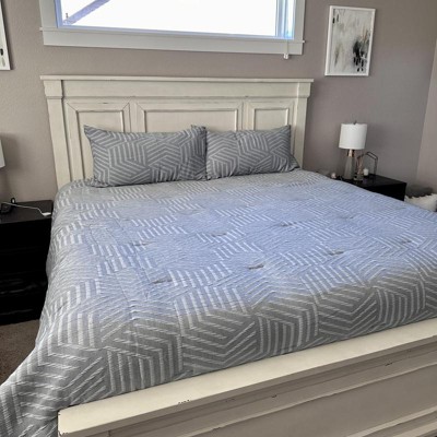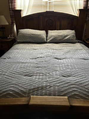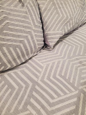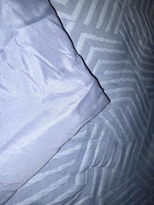 [This review was collected as part of a promotion.] We were in desperate need of a new comforter set. I love the look of crisp white ones but since I dye my hair, a white comforter is out of the question. This comforter set is a soft blue toned grey with stripes. Could easily go with any decor.