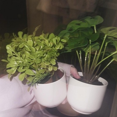 Lovely little plant, easy to clean if smudged, bright white faux planter, cute & small. Perfect for my end tables in the living room.