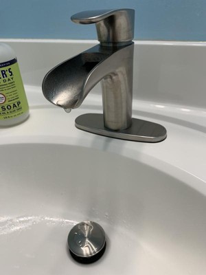[This review was collected as part of a promotion.] This faucet was a quick and easy install taking only about ten minutes. The waterfall style gives the bathroom a stylish, upscale look. The flow rate is slower than a traditional faucet, but I imagine that has to be in order to keep the water from overshooting the sink basin. Even though it’s slower, it’s perfectly adequate for bathroom sink needs and likely saves water in the long run. I like the pop up drain over the traditional lever ones as well. I also like the brushed finish. Overall this faucet seems to work as expected and appears to be quite good quality.