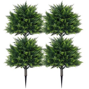 Enhance your outdoor space with this Artificial Cypress Topiary Trees, the perfect addition to your front porch, patio, garden, or seasonal decorations. Crafted with high-quality, UV-resistant materials, these faux plants maintain their vibrant green color year-round without fading, ensuring long-lasting beauty even under direct sunlight. Each topiary tree features a sturdy ground spike for easy installation and secure placement in soil, gravel, or pots, making them versatile for various outdoor settings.These artificial cypress topiary trees offer a realistic appearance with meticulously designed foliage that mimics natural boxwood shrubs, providing a lush and elegant look without the hassle of maintenance. Ideal for those who want to enjoy the charm of greenery without watering, trimming, or worrying about pests.Perfect for enhancing your garden landscape, decorating your front porch, or adding a festive touch to your Christmas décor, these faux topiary trees bring a touch of sophistication and greenery to any environment. Their durable construction withstands different weather conditions, making them an excellent investment for year-round outdoor decoration.Points:- 4 Pack Artificial Cypress Topiary Trees for versatile outdoor decoration- UV-resistant material ensures vibrant color and durability in sunlight- Realistic faux boxwood shrubs with detailed foliage for natural appearance- Includes ground spikes for easy and secure installation in various surfaces- Low maintenance, no watering or trimming required- Ideal for front porch, patio, garden, or holiday decorations- Weather-resistant design suitable for all seasonsTransform your outdoor living spaces effortlessly with these beautiful, maintenance-free artificial cypress topiary trees that combine style, convenience, and durability.