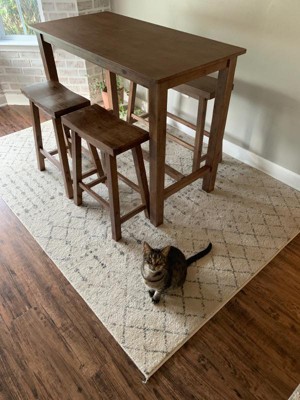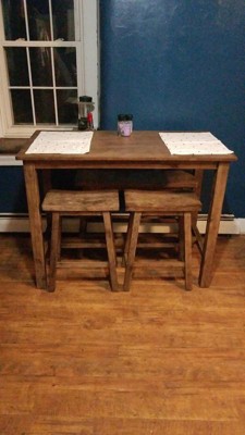 Bought this table set for our kitchen as a go to place for breakfast or a quick bite. Be aware that it is a weathered type look. Some people may not like that. It is sturdy and was easy to assemble. It is a good value for the money.
