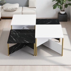 • Unique Design: Enhance your living space with this set of four modern nesting coffee tables. Featuring a chic black and white marble-like finish and elegant gold-colored metal legs, perfect for contemporary or transitional interiors.