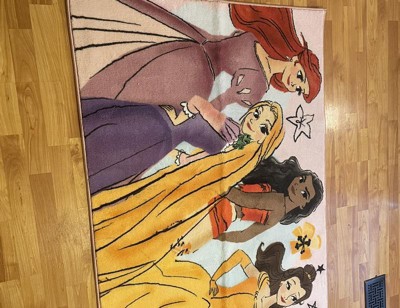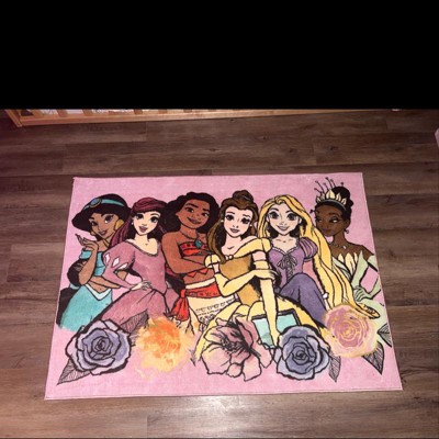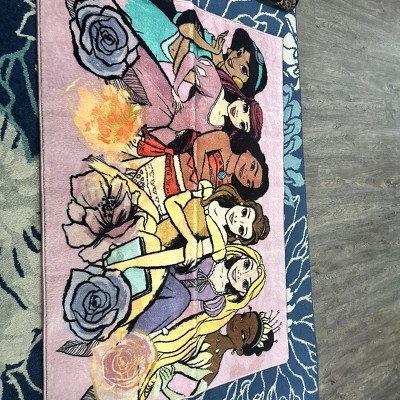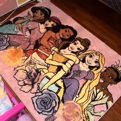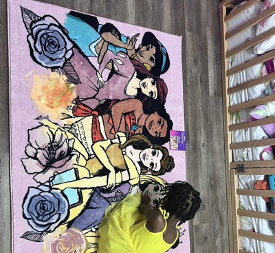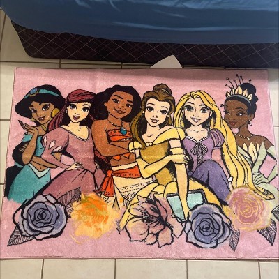 • A: The rug features popular Disney princesses: Jasmine, Ariel, Moana, Belle, Rapunzel, and Tiana.