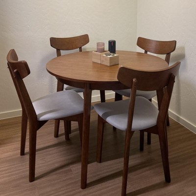 This is an absolutely beautiful, high-end looking table! Worked perfect with the chairs I ordered as well! It is heavy, solid wood I would recommend putting 1” wool furniture pads under the feet if you have wood floors, I happened to have had some. Perfect color that I was hoping for. Some complaining about some oily shiny little spots on the table. And yes I did have a few however, I can’t see them at all unless I stand at a certain angle and the sun or light is shining on it so I’m not bothered because I love the table!! so easy to put together took me just about 10 minutes, and I did by myself with no help. Fully recommend.