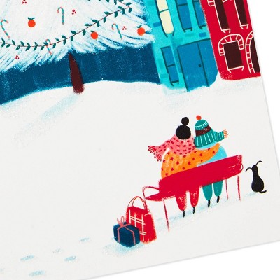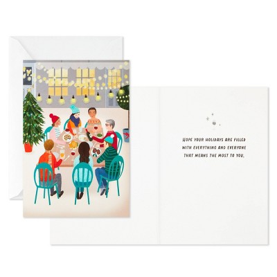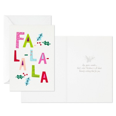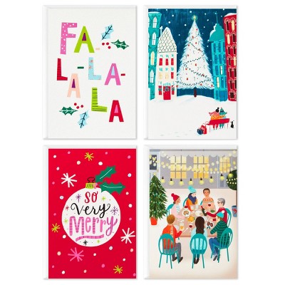 Delight your friends and family this year with these festive holiday cards featuring cheerful glitter-accented designs. Inside of Fa-la-la-la design reads: "Sending merry vibes your way!", city tree design: "May every shining joy of Christmas be yours," ornament design: "Hope this Christmas is your best one yet!", gathering of friends design: "Hope your holidays are filled with everything and everyone that means the most to you." With 40 cards and envelopes (10 of each design), this pack includes just the right amount for sharing holiday greetings with everyone on your list. The Hallmark brand is widely recognized as the very best for greeting cards, gift wrap, and more. For more than 100 years, Hallmark has been helping its customers make everyday moments more beautiful and celebrations more joyful.