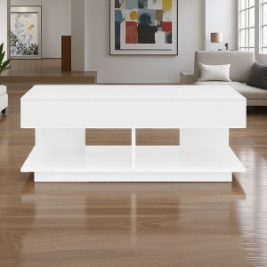 This coffee table combines innovative functionality with modern design. The extendable tabletop adapts seamlessly for gatherings or compact daily use, featuring a smooth-glide mechanism for easy adjustment. Versatile storage includes open shelves, small cubbies, and a central display space, keeping your living area organized and stylish. Built-in 16-color LED strip, controlled via Bluetooth app, allows effortless lighting customization for any occasion. Durable MDF base provides stability, and tool-free assembly ensures quick setup. Practicality, aesthetics, and smart features converge in this versatile centerpiece.