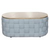 - The tabletop is covered with a light teal chenille fabric, offering a soft and textured surface that adds a cozy and inviting atmosphere to the dining or living area.