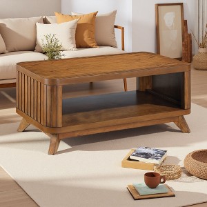 Solid Wood Coffee Table: Made from a combination of solid pine wood and MDF. The top and bottom shelves are MDF with solid wood veneer. Waveform decorations on the sides and bottom frame, plus 4 solid pine legs, provide both durability and aesthetic appeal.
