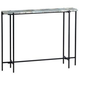 Polished Green Quartz Top features rich veining and organic tones, adding a natural and elegant touch; Sleek Black Iron Frame provides sturdy support while enhancing the modern, minimalist aesthetic; Clean Lines Design offers a contemporary look that complements a variety of interior styles; Rectangular Shape makes it a versatile addition to entryways, living rooms, or hallways; Minimal Assembly Required for quick and effortless setup; Quartz Surface is durable and stylish, making it a standout statement piece; Due to inconsistencies of various monitors, handheld devices, lighting, digital photography, and variances that occur naturally in materials, the color you see on your screen may vary slightly from the products received.; This product has components made of natural materials which make it unique and can lead to slight color/size variations.