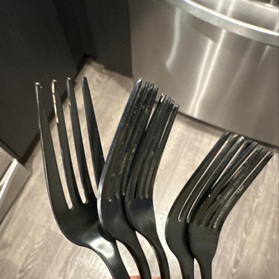 Poor quality, so disappointed about the complete WASTE of money these cheaply made utensils were. We've only had this silverware for 1 week. The packaging states dishwasher safe. The matte black coating started to peel off after one run through the dishwasher. And now, since we've opened and used, we can't return. I'm fuming. Don't waste your time.