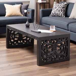 Description47.2" Solid Black Carved Wood Coffee Table ¨C Handcrafted Look with Ornate Side Panels