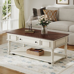 - (Classic Farmhouse Design): Features a 47.2¡¯¡¯W x 23.6¡¯¡¯D x 19.6¡¯¡¯H rectangular tabletop with wood spindle-shaped legs, retro trim panels, and dark brown handles, adding timeless farmhouse charm to any living room.