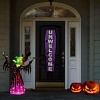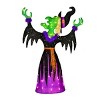Dressed in a purple-accented black robe and hat, this green witch looks up, mouth open with arms outstretched in an evil laughing pose. She is constructed of a glittering tinseled fabric that is wrapped around a sturdy wire frame and lit from inside with 100 LED lights. This fun decoration can be displayed in indoor or outdoor locations.