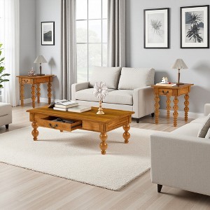 Vintage Wooden Coffee Table Set: Finished with a solid wood weathered pattern, featuring gourd-shaped legs and a unique surface chipped treatment for a classic aesthetic. Perfect for vintage or farmhouse-themed interiors.