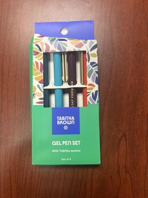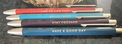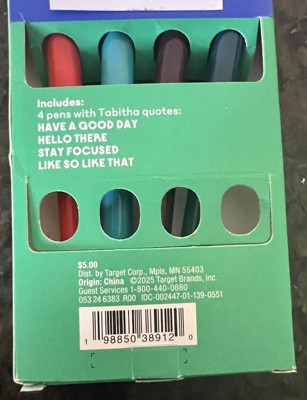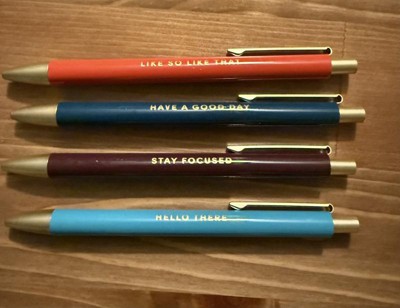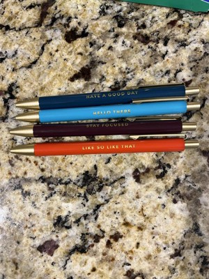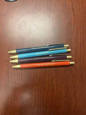 These are cute pack of 4 pens. I like the different positive saying in each pen and the different colors of each. Happy with how they feel and how they write. They are good quality pens. Would recommend.