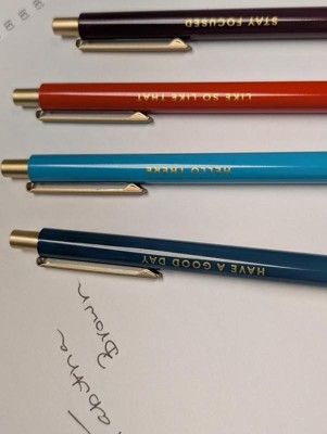 These rollerball ink pens have a nice heft and hand feel for writing. The ink is nice and dark and dries pretty quickly, although from my photo you can see that it will smudge a bit if you run a finger over your writing immediately (so don't do that). The messages on the pens are I guess supposed to be whimsical or cute - they're fine. Although one didn't really make sense to me. Overall - writing with them is nice and having a nice pen handy is always a good idea. If you enjoy writing instruments, this is a solid choice.