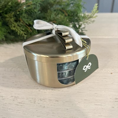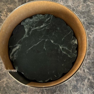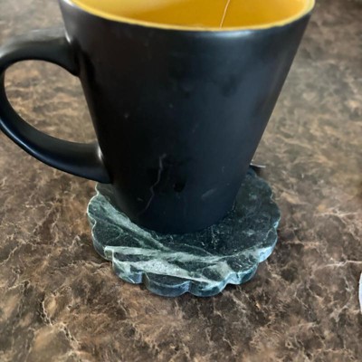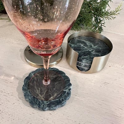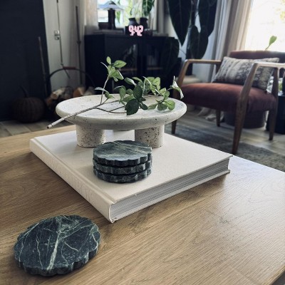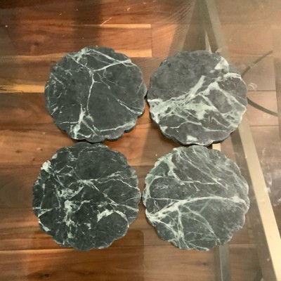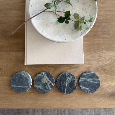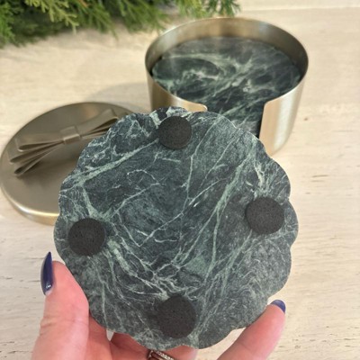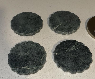 [This review was collected as part of a promotion.] These scalloped coasters are the perfect table side piece. They are very functional but also adorable. I love the dark green marble design and that they come in a cute little holder that has a bow on the lid. This is a four pack so it’s very convenient. They are very heavy duty and have little non slip grips on the bottom so they will stay in place. Such a good buy to help prevent table stains.