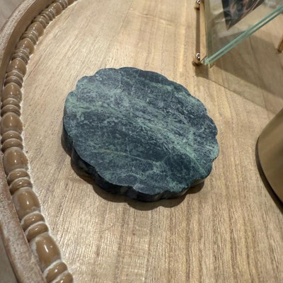 Elegant and substantial - the deep green color and scalloped edges make these coasters special. I saw them online, ordered and was not disappointed. You might walk by them in the store as they are packaged in a bow topped brass tin without a picture on the outside.