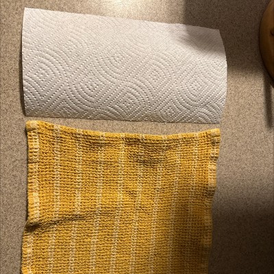 I love these! They are very thick and absorbent. The big waffle weaves help collect all the crumbs off the counters, and the large size helps it fold over a few times before you empty it in the trash. The material is nice, it feels natural and doesn’t get stinky easily. Sometimes I just pour leftover hot water on them throughout the day to quickly sanitize. They look really cute, but the white ones got kind of dingy after a few washes. We have hard water so that might be it. I’m going to try and whiten them, because they’re very cute and seem like they will last for years and years. I was pleasantly surprised to find these at Target, it seems like something you would have to get from expensive specialty stores.