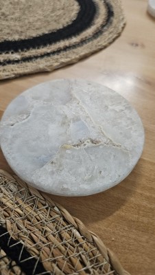 Keep your table free of water-ring marks and beverage stains with this 4-Pack Stone Salt Agate Coasters from Threshold™. This set of four coasters brings function and style to your entertainment table. Featuring a round shape and stone construction in a brown-and-ivory salt agate stone finish, they add a beautiful, natural accent to your table decor. The thickness of these drink coasters protects your tabletop from unnecessary scratches, stains and spills from glasses and cups. Plus, they're easy to wipe clean with a damp cloth.