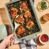 The 4qt Stoneware Rectangle Baking Dish with Lid Cream by Figmint™ is a versatile and visually appealing kitchen essential. Its elegant cream-colored stoneware complements any decor, and its durable construction ensures even cooking and easy clean-up. With a 4-quart capacity, it's perfect for various dishes, while the included lid preserves flavors and aids in transport. Of Note: as stoneware, this should be gently cooled, not immediately set on a cool surface, or in cold water. This baking dish's ease of use and impressive presentation make it a valuable addition to any kitchen.