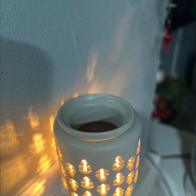 A: The scent warmer has an allover paisley pattern with cut-out detailing for a soft glow.