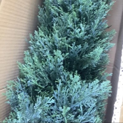 First of all, this is not the lush green shade shown in the picture. It is totally like a blue spruce color type of “tree”. I am including pictures, hopefully they will show up. Secondly, this is not 5 foot tall, not from the very base of the pot to the very tip of the very top of the 5 foot alleged tree. Thirdly, this is also very artificial looking, again refer to the photos please. Lastly, the pot is not black like shown in the picture, but is more of a light grey. Disappointed that it looks so drastically different than the picture.…..But I guess it will be fine. Not worth the hassle of returning. Then again, this was over $160 with tax, so I probably will return it. To me, it’s not even worth $60. Sorry.