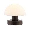 This cordless mushroom lamp has a minimalist look with its modern dome shade and vintage bronze finish. Cordless, portable lamp has a rechargeable battery for convenient accent lighting on a bar, console, or vanity. The frosted glass shade and warm LED bulb work together to produce soft ambient lighting. Dimmable built-in LED lights, so no bulbs are required . Integrated 2.5W LED bulb. Color Temperature: 3000K. CRI: 80.