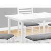 This contemporary 5pcs dining set features a 40" long rectangular table with a grey laminate tabletop, 3 armless metal chairs and a bench for your casual dining space.