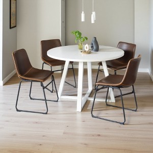 Descriptions Discover the Roundhill Varna 5-Piece Round Dining Set! This set includes a stunning round dining table and 4 stylish chairs, making it the perfect addition to your dining area. The dining table features clean lines and a bright minimalist design. The white-stylized trestle table base add an elegant touch, while the melamine table top offers durability and minimalist charm. With Rubberwood base and a decorative laminate MDF top, this round table provides ample space for hosting family and friends. The chairs, with a stable metal sled base and detailed stitching, feature a minimalist design in antique faux leather. Don't miss the opportunity to enhance your home with the beautiful Roundhill Varna 5-piece dining set! Available in three chair colors: Antique Brown, Antique Gray, and White. Dimensions